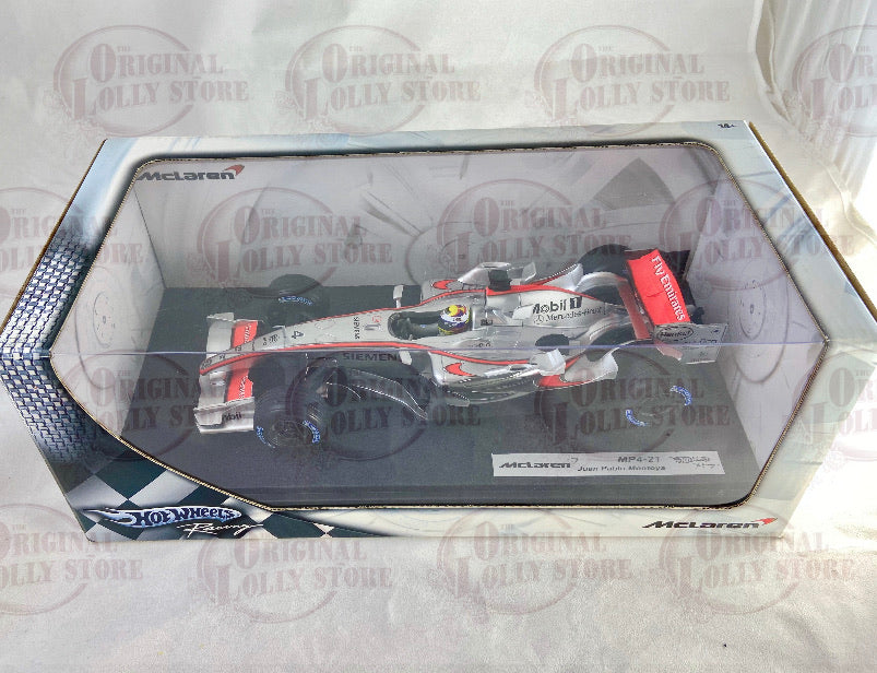 Rev your engines and get ready to cruise in style with this Hot Wheels Racing Car McLaren MP4-21 Juan Pablo Montoya! This die-cast collectible of Michael Schumacher is 1:18 scale and measures 25cmL and 10cmW, plus it's 34cmL x 17cmW x 12cmH box is perfect for displaying your racing pride. Hit the gas and speed into action with this awesome car!
